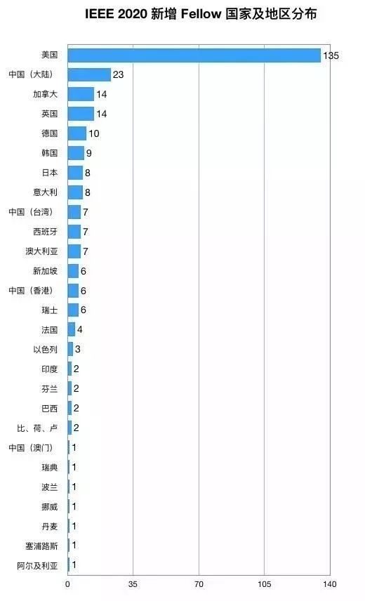 我们统计了来自不同国家及地区的新增 Fellow 人数,其中美国 135 人,其次是中国 37 人(大陆地区 23人,台湾地区 7 人,香港地区 6 人,澳门地区 1 人)。 从图中可以看出,除美国外,电气、电子工程的优秀人才主要集中在中、加、英、德、韩、日、意等国家。