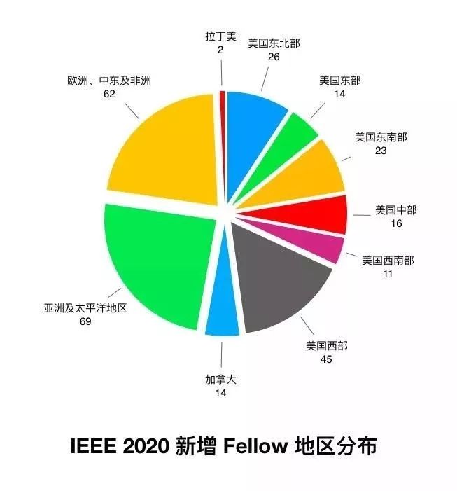 本届新增IEEE Fellow中,共有149位来自北美洲(其中135位来自美国,14 位来自加拿大),69位来自亚洲及太平洋地区,62位来自欧洲,拉丁美洲只有 2人,而非洲则没有入选人员。