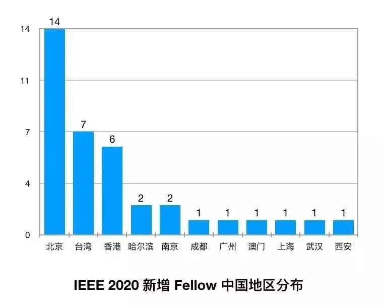 为了便于我们了解IEEE Fellow在中国地区的分布,我们统计了不同城市或地区的数据,如下图所示: