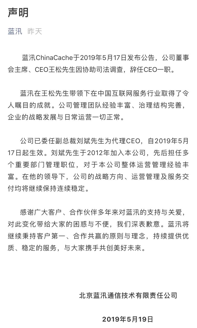 日前,纳斯达克上市蓝汛公司的董事长兼CEO王松因涉嫌企业贿赂而遭到调查,目前已经被捕。蓝汛发布公告称王松已经辞任董事长和CEO职位,由公司负责新产品开发的副总裁刘斌任代理CEO。