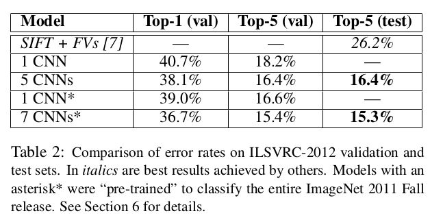 ImageNet Large-Scale Visual Recognition Challenge (ILSVRC) 2012 大赛测试集和验证集的错误率比较。斜体结果表示其他方法得到的最有结果。带星号*的结果是用“预训练”的模型来识别ImageNet 2011 Fall样本的结果。