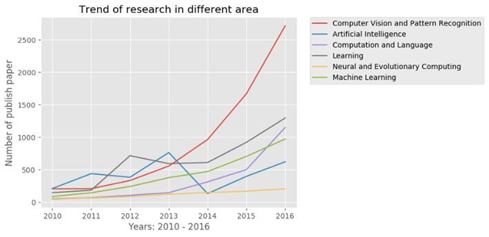 你看见代表Computer Vision and Pattern Recognition的红线从2012年之后飙升得非常明显了吧?这种情况很大程度上要归功于这篇论文。