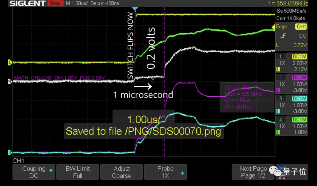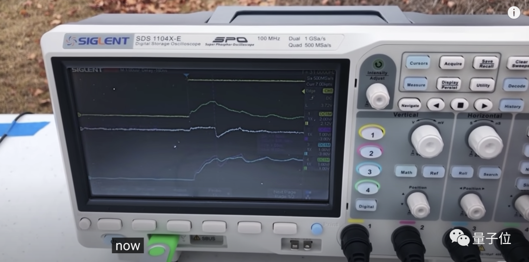 在剪断导线之后,他再次按下了开关,示波器捕捉到的信号如白线所示: