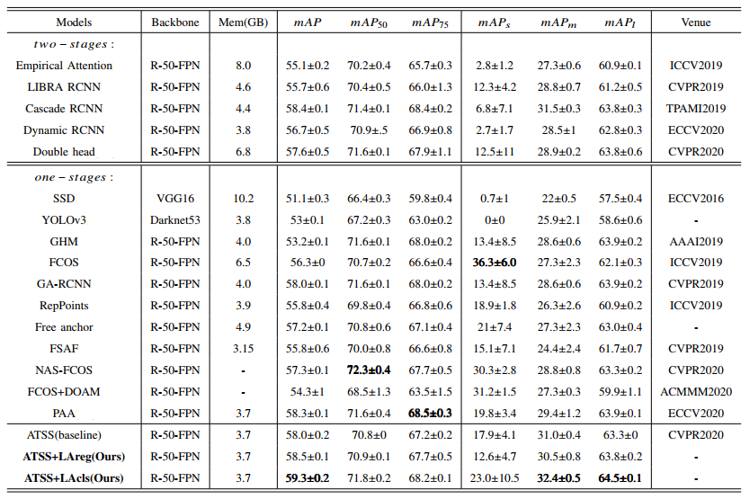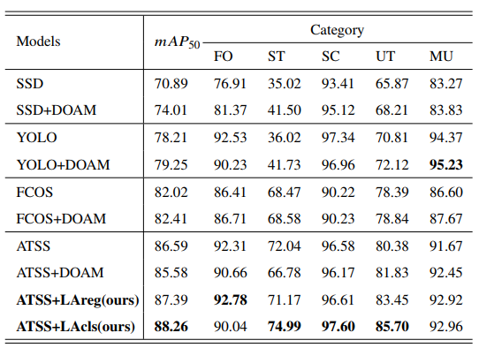 在OPIXray数据集中,我们使用ATSS作为基线,并测试它的性能。此外,我们测试了在ATSS上使用DOAM[3]、LAreg和LAcls的性能,其中DOAM是OPIXray文章中提出的方法。所有测试方法的配置与在CLCXray数据集上的配置一致。如表1的mAP50 所在列所示,ATSS比SOTA模型FCOS+DOAM高了4.17%。在这样的强基线上,LAcls将ATSS提高了1.67%。在CLCXray数据集中,我们测试了目前的SOTA模型FCOS+DOAM,以及近年来通用目标检测的先进模型。同样,我们使用ATSS作为基线并测试其性能。我们还测试了LA对ATSS 的改进。如表2的mAP列所示,基线 ATSS比FCOS+DOAM 高 3.7%。在这一强基线上,所提出的方法 LAcls将ATSS提升了1.3%的mAP,而LAreg对ATSS提升了0.6%的mAP。与相对早期的方法相比,各个方法在CLCXray上的提升较小,说明 CLCXray具有挑战性。此外,在所有模型中,ATSS+LAcls 在mAP上的得分最高。