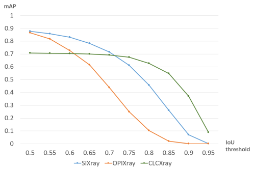 与 GDXray、SIXray 和 OPIXray 相比,CLCXray 具有以下独特的特性:首先,CLCXray 中多个对象之间的重叠更多,这是因为平均每张图像的标记对象更多。CLCXray数据集中近 60%的X光图像包含至少两个或多个前景。在SIXray和OPIXray中,只有少数X光图像包含多个对象。其次,CLCXray中的类别包含液体容器,这在以往的研究中是没有见过的。液体容器可能含有有毒、腐蚀性、易燃易爆的液体,这些液体很危险,但很容易被忽视。第三,CLCXray有更准确的bbox标注。图2显示了通过在不同数据集上训练和测试基线模型 ATSS [5]获得的折线图。OPIXray 和 SIXray 上发生的急剧下降表明模型难以从框注释中学习准确定位。此外,我们将不同数据集的注释可视化,如图 3 所示。与 SIXray 和 OPIXray 相比,CLCXray 的注释在视觉上更贴合对象边缘。