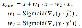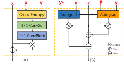 在基于类别的方法设计中,我们最初的想法是让网络直接通过分配标签的类别和预测的多类置信度来学习用于调节特征图的权重。因此,LA的早期版本首先计算预测类别和类别标签的置信度的交叉熵,然后根据计算结果使用一组1x1卷积来学习权重。该方法的网络结构如图5(A)所示。虽然早期版本的LA可以提高模型的性能,但它不稳定,缺乏可解释性。为了让生成的权重能够合理地反映特征和标签之间的对应关系,我们利用了梯度。对于特定类别的预测置信度,特征图对应的梯度反映了特征图上不同位置的重要性,以提高置信度。因此,这个梯度与我们的目标是一致的。考虑到残差的形式有利于恒等映射,生成新特征图的公式有以下形式: