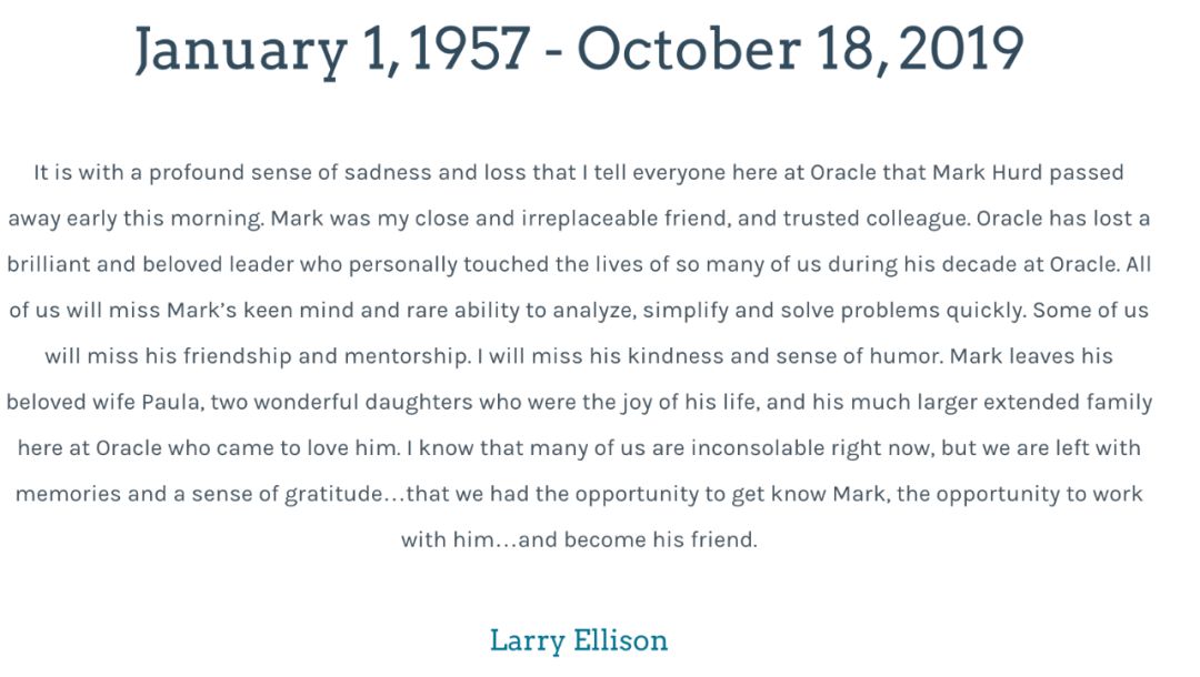 带着深深的悲伤和失落,我告知甲骨文的所有员工,马克 · 赫德今天早上去世了。马克是我亲密的、无可替代的朋友和值得信赖的同事。甲骨文失去了一位才华横溢、深受爱戴的领袖,他在甲骨文工作的十年间,触动了我们许多人的生活。我们都会想念马克敏锐的头脑和罕见的快速分析、简化和解决问题的能力。我们中的一些人会想念他的友谊和指导。我会想念他的善良和幽默感。马克离开了他深爱的妻子宝拉,两个可爱的女儿是他生命中的快乐,还有他在甲骨文的大家庭,大家都爱他。我知道现在我们很多人都伤心欲绝,但让我们留下回忆和感激之情,感激我们有机会认识马克,有机会和他一起工作,成为他的朋友。
