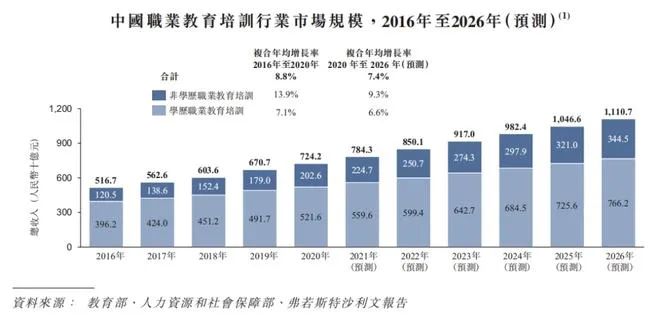 弗若斯特沙利文报告显示,中国职业教育培训行业的市场规模以收入计算,从2016年的5167亿元增至2020年的7242亿元,复合年均增长率为8.8%,预期到2026年将达到11107亿元的规模。