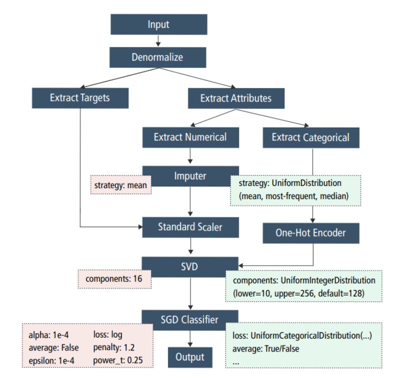 如下所示为从输入数据到输出预测的一个物理 Pipeline,其中每一个物理 Pipeline 都是通过贝叶斯优化从逻辑 Pipeline 生成的。