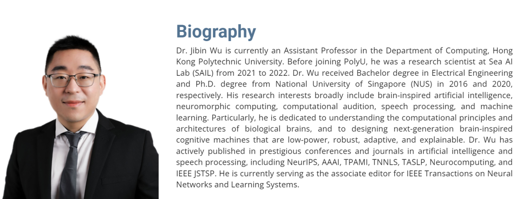 吴冀彬博士:现任香港理工大学助理教授。他曾于 2016 年和 2020 年在新加坡国立大学取得学士和博士学位,并于 2021-2022 年在 Sea AI Lab(SAIL) 担任研究科学家。他的主要研究方向包括类脑计算、语音信号处理以及机器学习,其相关研究工作多次发表在人工智能和语音信号处理领域国际顶级会议及期刊上,包括 NeurIPS、AAAI、TPAMI、TNNLS、TASLP、Neurocomputing、IEEE JSTSP 等。他曾带领新加坡国立大学团队参加国际大学生类脑计算大赛,并在 2018 年和 2019 年分别获得一等奖和二等奖。他目前担任神经网络及人工智能领域顶级期刊 IEEE Transactions on Neural Networks and Learning Systems 副主编,同时担任多个国际学术会议的程序主席。