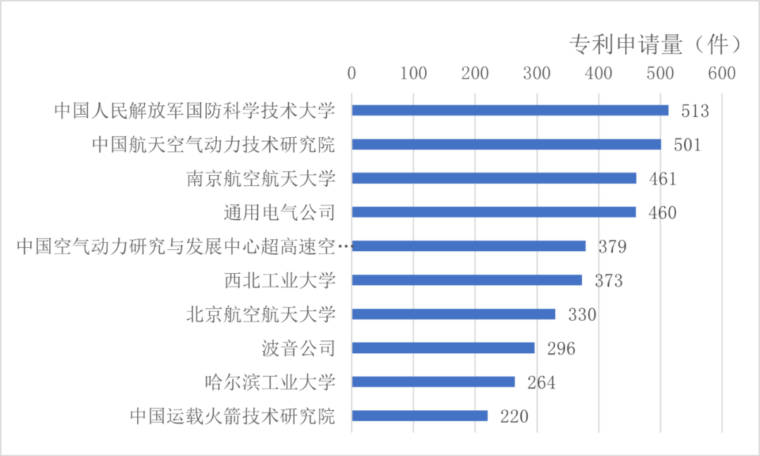 高超音速专利申请量前十强的机构之中,中国机构占据 8 席,分别是中国人民解放军国防科学技术大学、中国航天空气动力技术研究院、南京航空航天大学、中国空气动力研究与发展中心超高速空气动力研究所、西北工业大学、北京航空航天大学、哈尔滨工业大学、中国运载火箭技术研究院。其余 2 所机构均来自美国,分别为通用电气公司、波音公司,如图 6所示。这再次显示出中国机构在高超音速领域强大的技术创新实力。