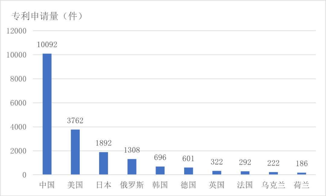 从专利申请情况来看,近 20 多年来,全球高超音速专利申请集中在中国、美国两个国家,二者专利申请量合计占全球的六成以上。其中,中国相关专利申请量居世界第一,占全球总量的 46.5%;美国排名第二,占全球总量的 17.3%;其他前十国家依次是日本、俄罗斯、韩国、德国、英国、法国、乌克兰、荷兰,如图 5 所示。