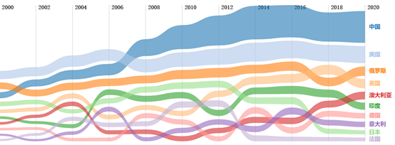 在近20多年的高超音速相关论文之中,论文发表量前十国家依次是中国、美国、俄罗斯、英国、印度、澳大利亚、日本、德国、意大利和法国,如图 1所示。其中,中国的相关论文发表量居于全球领先位置,美国、俄罗斯分别居于第二、三位。