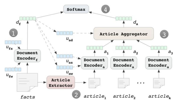 fact也通过Article Extractor抽取其中的匹配度较高的k个法条。