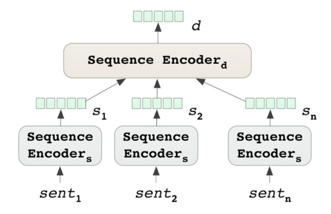 一个句子由多个词组成,一个文本由多个句子组成,可以先过句子级别的encoder,再过文本级别的encoder。如下图可以得到文本的embedding。论文中对这两个encoder都采用了Bi-GRU作为编码端,为了能够获取到更多的信息,论文还采用了attention机制。
