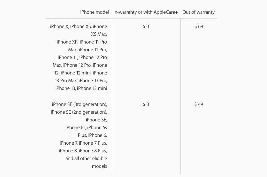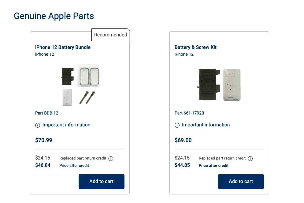 以最常见的更换电池为例。苹果为 iPhone 12、13 系列的电池和螺丝套件卖 69 美元,第三代 iPhone SE 的同类套件 49 美元。但看看苹果官网,保修期外的电池更换服务价格完全相同:iPhone 12 或 13 为 69 美元,iPhone SE 为 49 美元。苹果的新闻稿称,它以与其维修合作伙伴网络收取的「相同价格」销售这些零件。