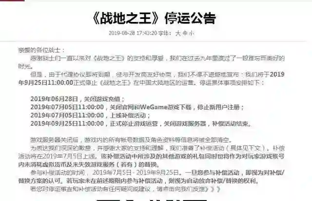 腾讯官方公告已经给出,《战地之王》国服将于 2019 年 9 月 25 日 11:00:00 正式停止运营,而游戏服务器关闭后,游戏内的所有帐号数据及角色资料等信息将被全部清空。此外,补偿活动将在 2019 年 7 月 5 日上线。该补偿活动中所涉及的其他游戏的礼包同时也将作为对玩家游戏账号内未消耗虚拟货币及未失效游戏服务(若有)的替换。