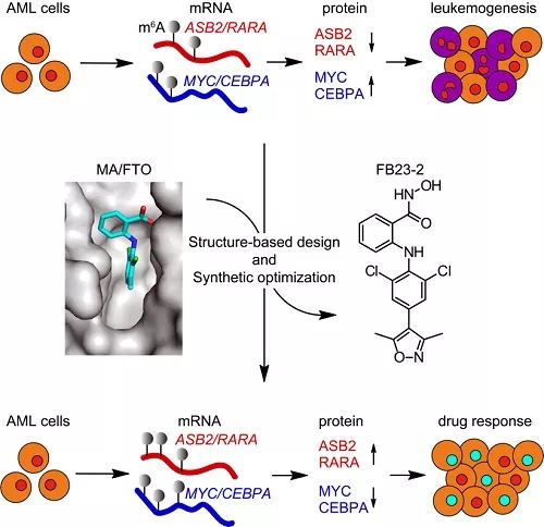 2011年,FTO(脂肪组织与肥胖相关蛋白质)被确证为调控RNA甲基化修饰的去甲基化酶。这一发现揭示了细胞内m6A修饰是动态可逆的过程,掀起了m6A修饰及其调控蛋白质生物学研究热潮,逐步形成了以m6A修饰为核心内容的表观转录学研究新方向。最近发现,FTO基因是白血病、乳腺癌、成胶质细胞脑瘤等癌症发生的重要致癌基因之一。国际上,高质量的FTO抑制剂及其干预m6A修饰在抗肿瘤靶标成药性的研究尚处于早期探索阶段。该研究以急性髓细胞白血病(AML)亚型中高表达的FTO为靶标,根据FTO识别m6A修饰底物的分子机制等特点,应用基于晶体结构的化合物设计、合成优化等手段,获得FTO小分子抑制剂。该化合物选择性抑制AML细胞中FTO的去甲基化功能,上调AML关键基因mRNA上m6A修饰,增加抑癌蛋白质例如ASB2和RARA的丰度,降低促癌蛋白质例如MYC和CEBPA的丰度,从而抑制AML细胞增殖,并且在PDX小鼠模型上展现抗白血病的治疗效果。此项研究从分子以及细胞层面上较充分表征了FTO抑制剂的选择性和靶向性,但其细胞内的作用机制尚需深入探索。由于FTO以及m6A修饰在实体瘤中也发挥关键的调控作用,该项研究针对RNA去甲基化酶FTO能否作为抗肿瘤药物靶标实现了药理功能确证,指明了分子靶向性干预m6A修饰从而影响基因表达来实现抗肿瘤的研究新方向。