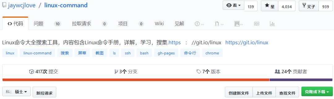 Linux-command目前已经获得4034个Star,939个Fork,(GitHub地址:https://github.com/jaywcjlove/linux-command)