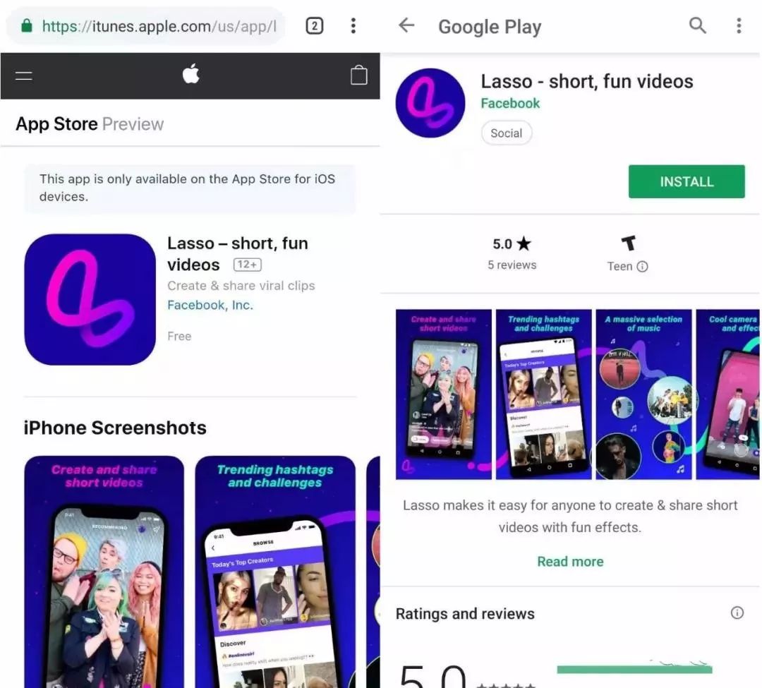 这不,Facebook 在最近低调上线了一个名叫 Lasso(字面含义:套索)的短视频产品。