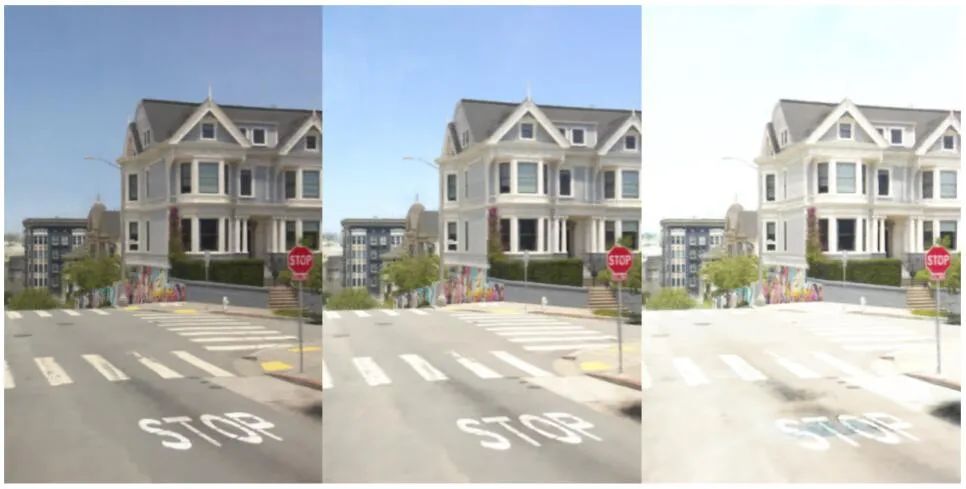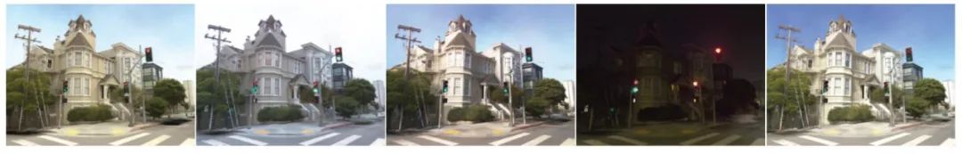 图 6. 当渲染基于多个 Block-NeRF 的场景时,该算法使用外观匹配来获得整个场景的一致样貌。给定一个 Block-NeRF(图左)的固定目标外观,算法会优化相邻 Block-NeRF 的外观以匹配。在此示例中,外观匹配了在 Block-NeRF 中产生一致的夜间外观。