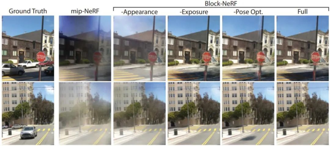 图 7. 多段数据的模型消融结果。外观嵌入有助于神经网络避免添加云雾几何体来解释天气和光照等环境变化。移除曝光会略微降低了准确度。姿态优化有助于锐化结果并消除重复对象的重影,如在第一行的电线杆上观察到的那样。