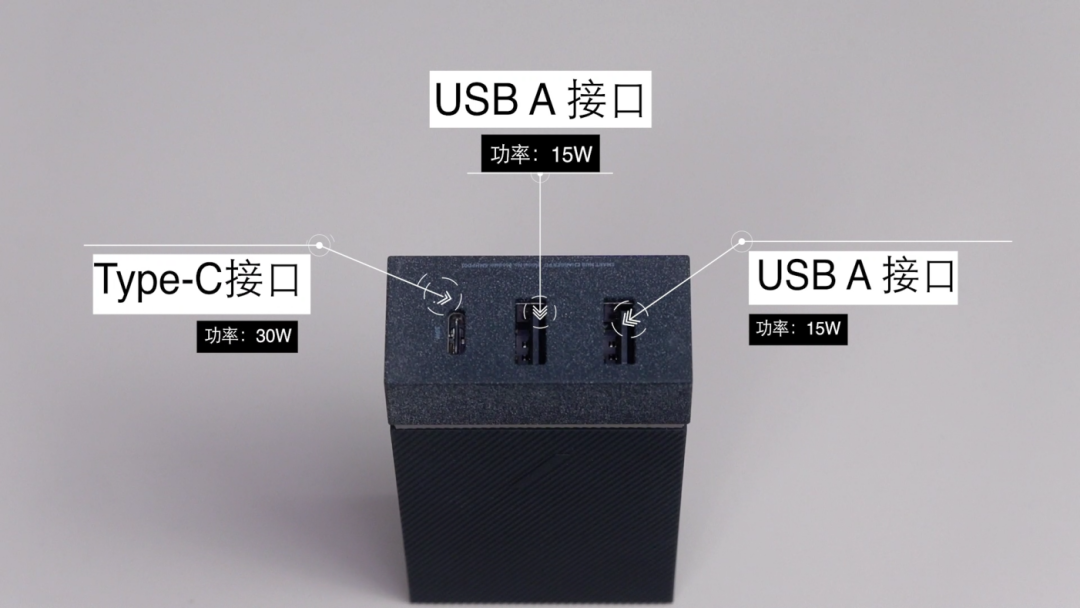接口有三个,两个A口加一个C口,满足我多个设备同时充电需求,C口最高30W,A口最高15W。智能IC技术会自动判断接入的设备,调整充电速度,保证不同的设备都能有最大充电功率。