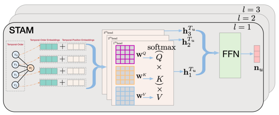 为了将时间信息整合到邻居嵌入学习中,STAM 利用 Scaled Dot-Product Attention 来捕获一阶邻居的时间顺序,并利用多头注意力机制在不同的潜在子空间上执行联合注意力。STAM 的整体架构如下图所示,它以时间序列 Tu 和 Tv 作为输入,输出一阶邻居的时空邻居嵌入表示。STAM 是一种时空聚合方法,从空间结构和时间顺序两个角度同时学习邻居的嵌入表示。我们将 STAM 应用到基于 GNN 的推荐中来学习用户和商品的嵌入表示。与基于 GNN 的推荐类似,我们堆叠多个 STAM 以捕获用户-商品二部图中的高阶交互信息。然而,当从一阶邻居逐层传播时空邻居嵌入表示时,STAM 将遭受成倍增加的内存消耗。为此,我们从时空邻居嵌入表示中学习一个时空注意力权重矩阵,并将其整合到邻接矩阵中进行用户/商品的嵌入表示学习。