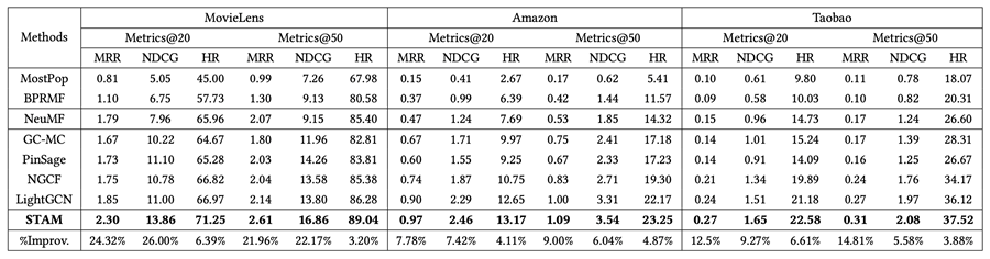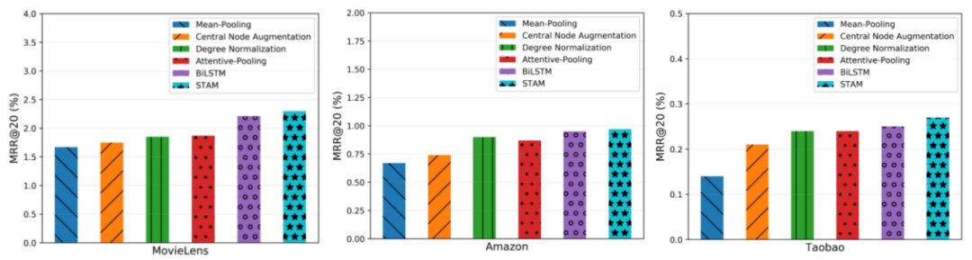 STAM 不改变基于 GNN 推荐的框架,可以很自然地插入到现有的基于 GNN 的推荐模型中。我们将 STAM 应用于基于 GNN 的推荐,并将其推荐性能与具有代表性的基于 GNN 的模型进行比较。实验结果表明,STAM 在 MRR@20 上的平均相对增长超过了目前最佳基线,例如在 MovieLens 带来了 24% 的性能提升,在 Amazon 上实现了 8% 的性能增长,在 Taobao 上优于最佳基线 13%。性能提升的原因来自于在邻居聚合中考虑了时间信息的影响,验证了时间信息对于邻居聚合方法的重要性。