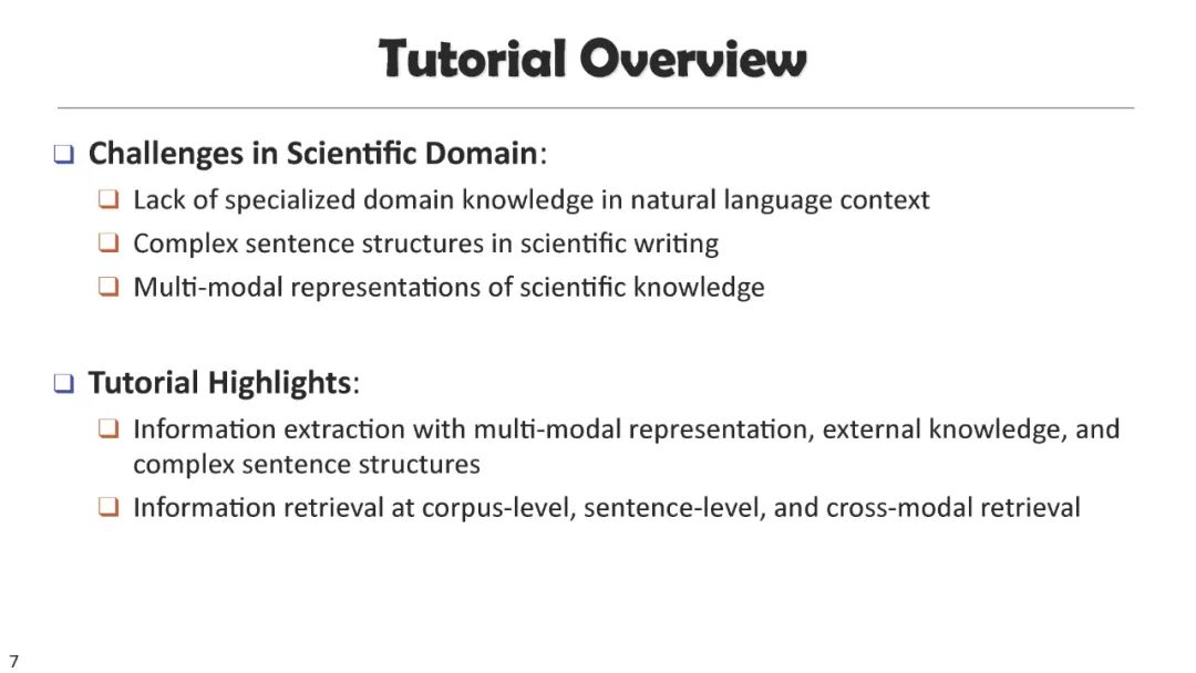 本教程针对对科学网络挖掘的自然语言处理(NLP)技术感兴趣的研究人员和从业人员。探索网络上大量快速增长的科学文献对科学发现非常有益。然而,由于缺乏自然语言环境下的专业领域知识、科学写作中复杂的句子结构以及科学知识的多模态表示,科学网络挖掘尤其具有挑战性。