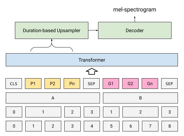 虽然 NAT 解决了稳健性问题,并在神经 TTS 中实现了精确的时长控制,但我们在此基础上进行构建,进一步改善对 TTS 输入的自然语言理解。为此,我们应用了 PnG BERT,它采用了类似于 BERT 的方法,但其本身专为 TTS 而设计。PnG BERT 基于大型文本语料库中相同内容的音素表征和字位表征,接受了自我监督预训练,然后用作 TTS 模型的编码器。这将显著改善合成语音的韵律 (Prosody) 和发音,尤其是在合成较为困难的情况下。
