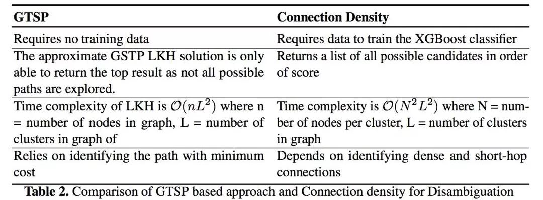 1) 基于广义旅行商问题(GTSP)的消歧方法。如下图所示,该方法将每个关键词的候选 URI 放入同一个簇。边的权重被设置为两个 URI 在知识库上的距离(hop 数),而联合消歧过程被建模为在该图上寻找一条遍历每个簇的边权总和最小的路(头尾结点可以不同)。