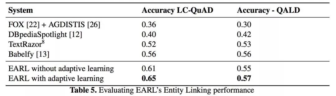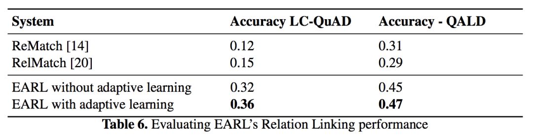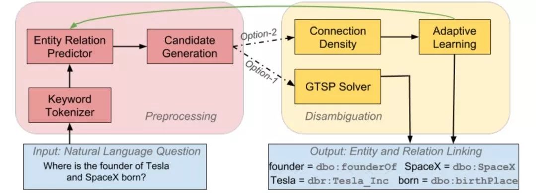 3) 额外的,本文提出了一种自适应实体/属性预测方法。如果消歧后某个实体/关系和它最终链接到的 URI 的置信度低于阈值,则可能预处理步骤的第二个子过程(实体/关系预测)有错误。在这种情况下,该工作会更改该关键词的实体/关系标签,重新执行候选生成和消歧步骤,从而获得整体精度的提升。