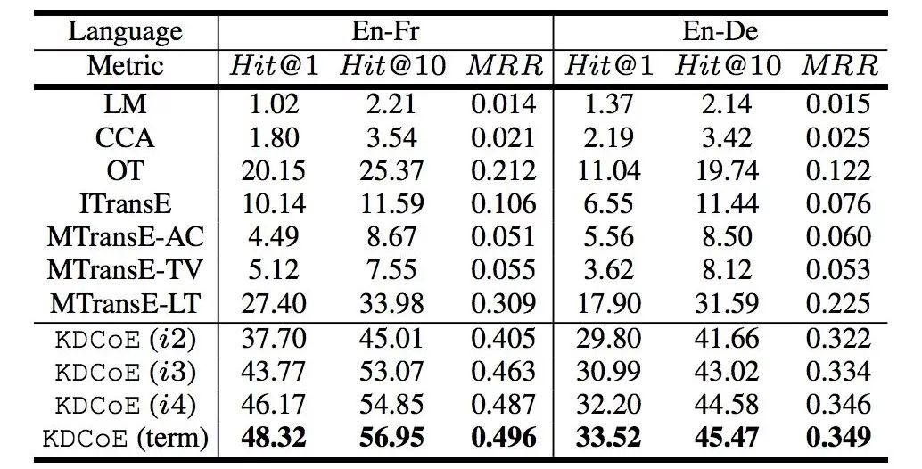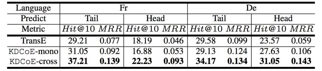 根据 KDCoE-mono 的表现,可以推断,该模型成功继承了 TranE 保持结构化知识中实体和关系的稳定性。而 KDCoE-corss 则反映引入跨语言信息确实对知识补全的效果起到了明显提升。