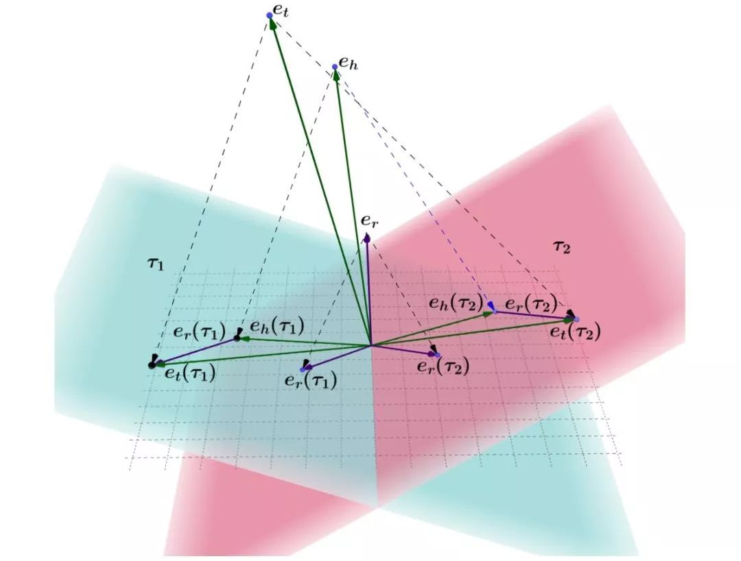 所以在本文的模型中,希望实体能够随不同的时间点有着不同的表示。为了达到这一目的,文中将时间表示成超平面(hyperplane),模型示意图如下: