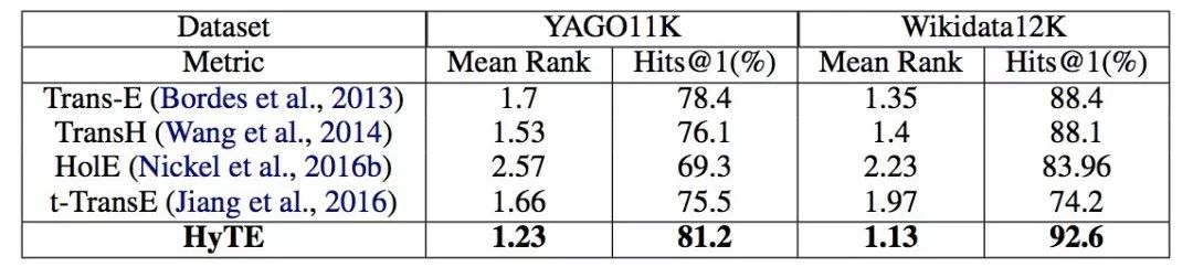 本文提出了 HyTE 模型,HyTE 不仅能够利用时间导向进行知识图谱图推理,还能够为那些缺失时间注释的事实预测 temporal scopes。实验结果表明该模型与传统模型或者同类模型相比都有着突出的表现。