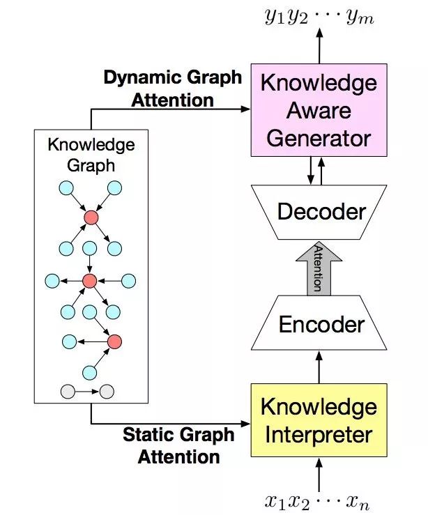 本文提出的方法,利用了大规模的常识性知识图谱。首先是理解用户请求,找到可能相关的知识图谱子图;再利用静态图注意力(static graph attention)机制,结合子图来理解用户请求;最后使用动态图注意力(dynamic graph attention)机制来读取子图,并产生合适的回复。