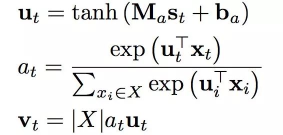 其中,ut 是由 GRU 中 st 产生的隐藏表示,attention 权值 at 则是由一个 softmax 函数计算得到,反映的是单词 xt 对于序列 X 的重要性,而后依据此权重与隐藏表示可以得到 self-attention 的输出 vt,|X|(输入序列的长度)用于防止 vt 失去原有的规模。
