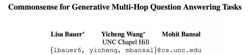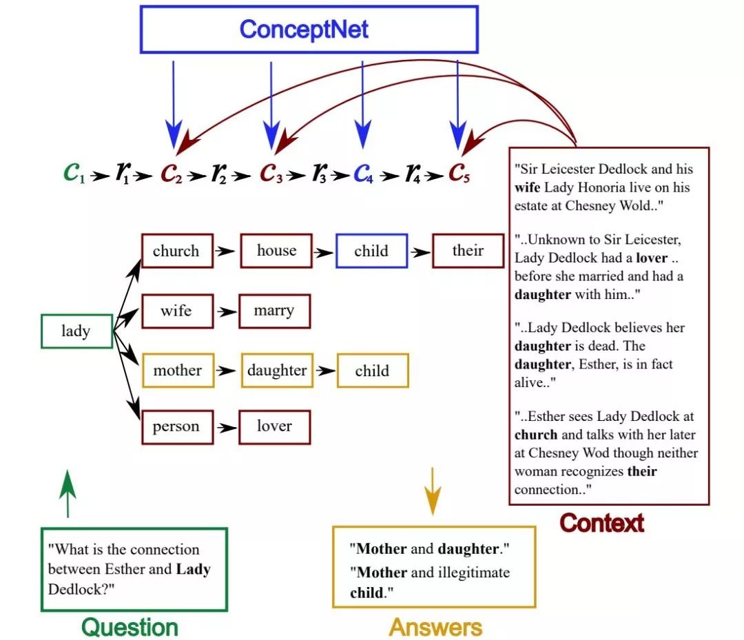 本文提出在 NarrativeQA 等需要多跳推理的文本进行生成式问题回答的模型。人工抽样数据集样本分析发现,许多样本答案的推理单凭文本包含的信息是无法完成推理并回答的,需要引入外部知识库中的常识信息。本文提出在常规的机器阅读模型中引入 ConceptNet 中的常识信息。