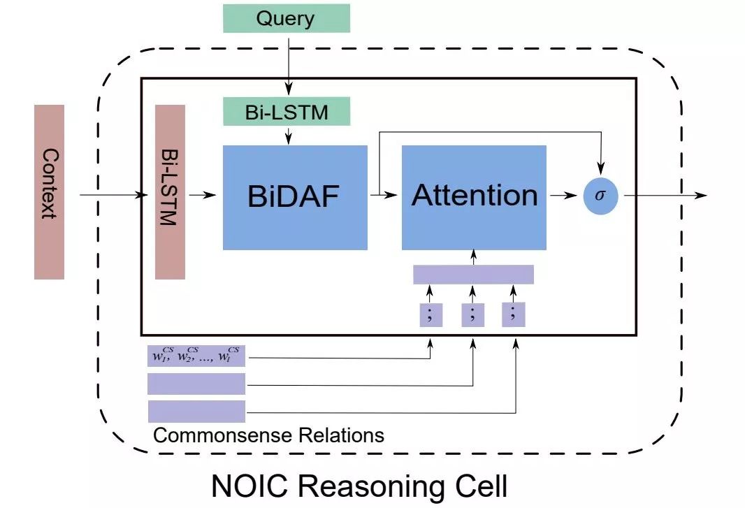 引入外部常识通过修改 Reasoning Layer 中的基本单元。具体做法是,每条路径的 embedding 表示为其每个节点的文本 embedding 的简单拼接,修改后的 Reasoning Cell 在经过 BiDAF 的 attention 结构后,再对该样本的所有外部常识三元组路径做 attention 计算,该 attention 计算再次更改文档和问题中每个词的表示。