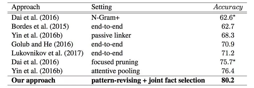 实验评价指标为准确率,仅当问题对应的事实与模型得到的实体和谓词两者都匹配时,才算准确匹配。