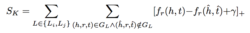 其中,L 表示某种语言,(Li,Lj) 表示一组语言对,GL 表示语言 L 对应的知识图谱,反映的是图谱中三元组 (h,r,t) 之间的相异度,r 是一个 positive margin,[x]+ 则表示取 x 的正值部分,