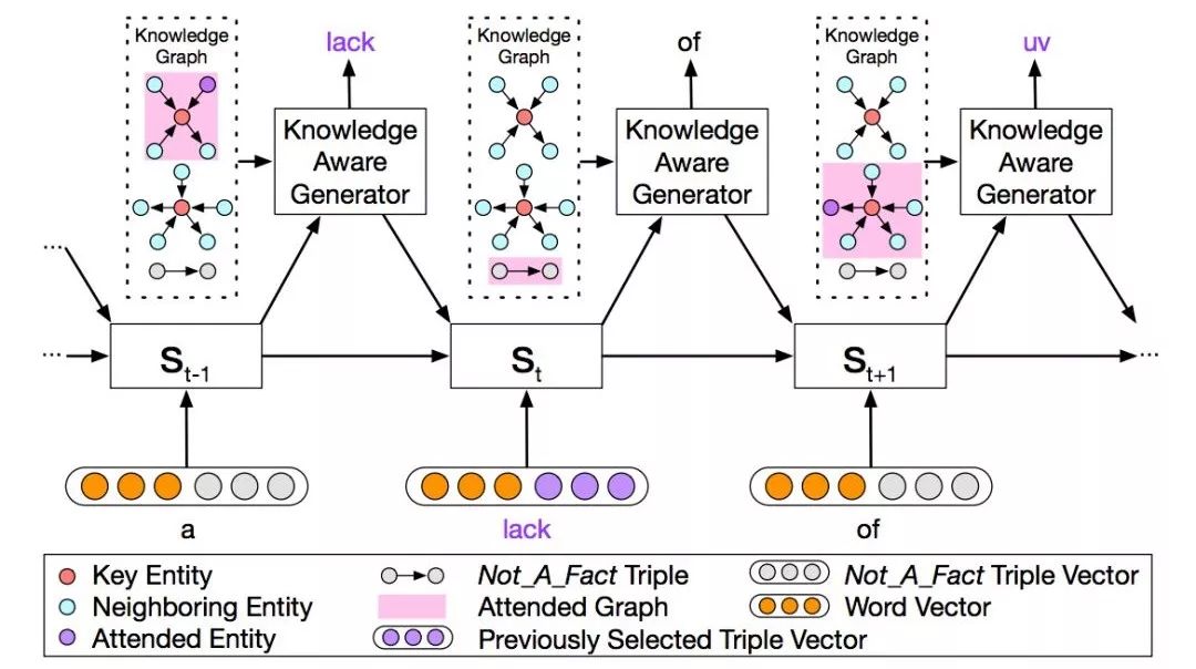 对于词“of”,由于无法找到对应的子图,所以就采用特殊子图 Not_A_Fact 来编译。之后,采用基于静态注意力机制,CCM 会将子图映射为向量 gi,然后把词向量 w(x_t) 和 gi 拼接为 e(xt)=[w(xt); gi],并将这个 e(xt) 替换传统 encoder-decoder 中的 e(xt) 进行 GRU 计算。