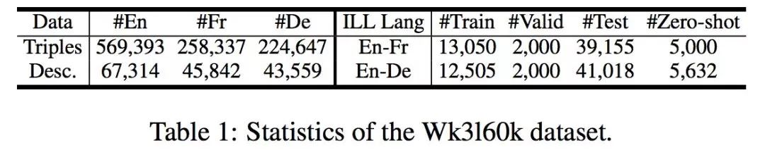 实验数据说明:文章实验数据来自 DBPedia 中抽取的子集 WK3160k,由英法德三语构成,其中每种语言数据中包含了 54k-65k 规模的实体。具体统计信息如下表: