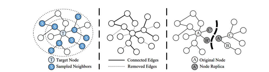 图级改进的说明: (a) 对2跳邻居进行抽样的图抽样方法; (b) 一种去除无用边的图稀疏化方法; c)一种图分区方法,将图划分为两个保存了节点副本的子图。