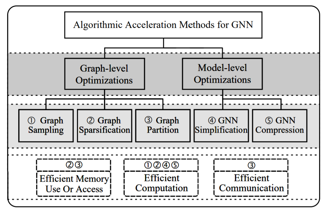 然而,目前还没有文献从算法层面系统地研究GNN的加速方法。实际上,算法级别的改进不仅提高了模型的精度,而且加速了模型的学习[Chen et al., 2018b; Bojchevski et al., 2020]。我们认为,GNN的算法加速方法将大大有利于训练和推理过程,同时,GNN框架的整体性能[Fey and Lenssen, 2019; Wang et al., 2019a],因为一个设计良好的框架加上一个优化的算法可以从经验上获得双重提升[Lin et al., 2020]。因此,尽管有一些关于图相关框架和硬件加速器的有见地的综述,但对GNN算法加速方法的全面综述是非常值得期待的,这正是本工作的目标和重点。