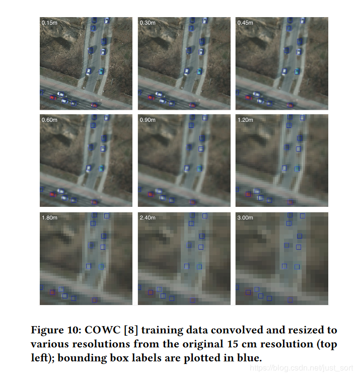接下来作者还对不同输入分辨率做了实验,下面的Figure10代表对原始分辨率(左上角的0.15m表示GSD是0.15m)进行不同程度的放大之后获得的低分辨率图像,这些图像都被用来训练模型,