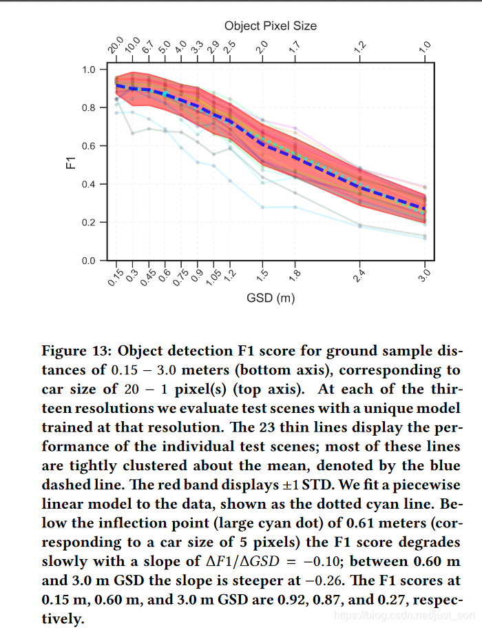 然后Figure13将不同分辨率输入下检测模型的F1值进行了图表量化,其中横坐标代表目标的像素尺寸。可以看到,随着分辨率的降低,图像中目标的像素尺寸也越来越小,检测效果(F1值)也越来越低。