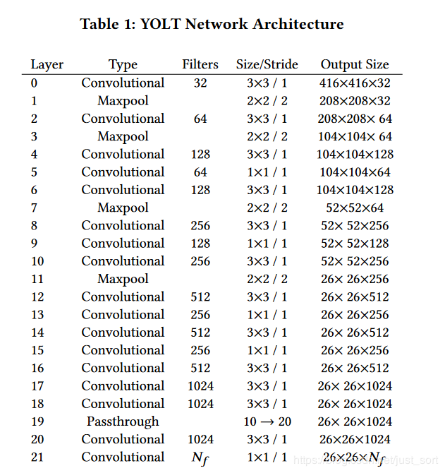 YOLT的网络结构如下面的Table1所示: