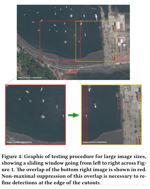 上半部分表示的是原始的卫星图片,因为图片分辨率太大,所以采用了划窗方式裁剪指定尺寸如 的图像作为模型的输入,论文将裁剪后的区域称为chip,并且相邻的chip会有15%的重叠,这样做的目的是为了保证每个区域都能被完整检测到,虽然这带来了一些重复检测,但可以通过NMS算法滤掉。通过这种操作,一张卫星图像会被裁剪出数百/千张指定尺寸的图像,这些图像被检测之后将检测结果合并经过NMS处理后就可以获得最终的检测结果了。